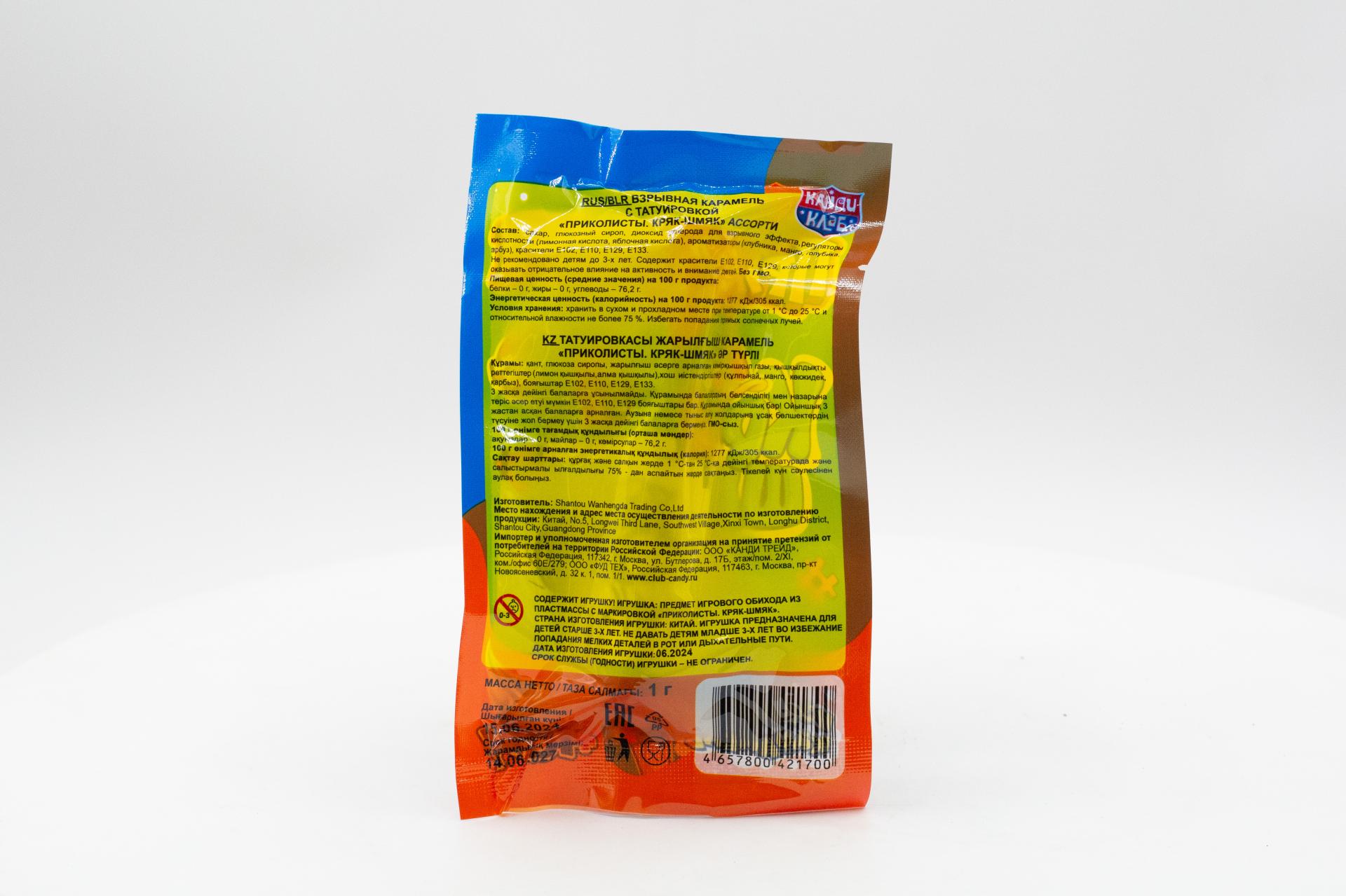 Взрывная карамель с игрушкой и татуировкой КАНДИ КЛАБ ПРИКОЛИСТЫ КРЯК-ШМЯК 1г15,38 руб. за штуку (в упак. 30 шт.) |